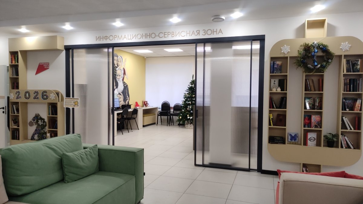 За стеклянной перегородкой с раздвижными дверями расположена информационно-сервисная зона библиотеки.