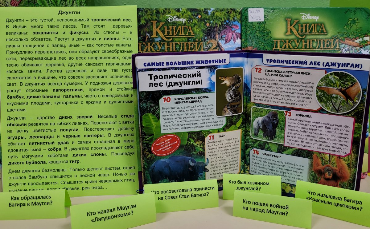 Ребята с большим удовольствием находят на картине джунглей героев произведений Киплинга. Это волки, пантера, медведь, удав, тигр, шакал, дикий слон, крокодил. Читатели отвечают на вопросы викторины: